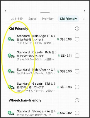 シンガポールの道路交通法は厳しく、135㎝以下の子供はチャイルドシート・ジュニアシートの着用義務がある。Glabで配車する場合は、アプリの画面上で必ず”Glab Family”という子供マークの付いた車を選択すること。
